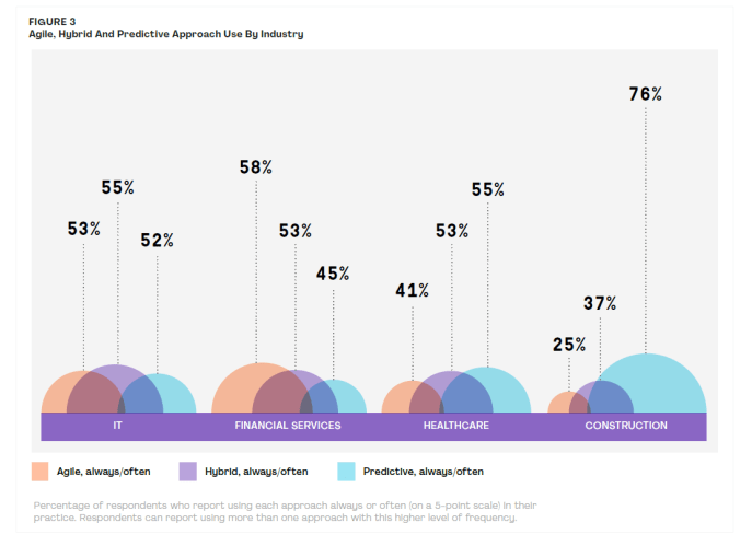 Fascinating to see the spread across different sectors using predictive(waterfall), agile and hybrid approaches to projects:
